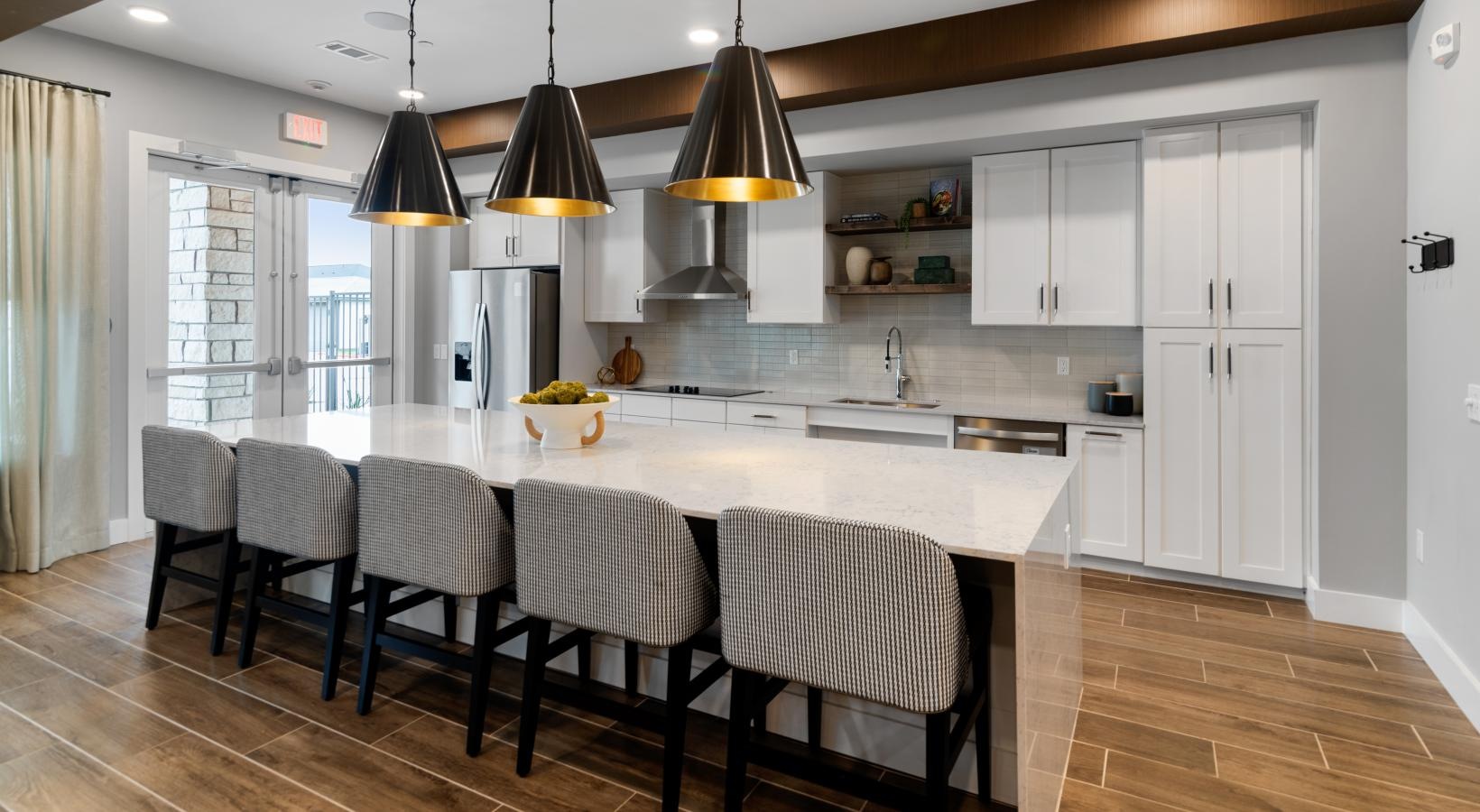 • a clubroom kitchen with a bar and chairs