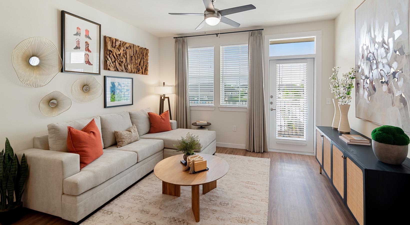 • a living room with a white couch and a table