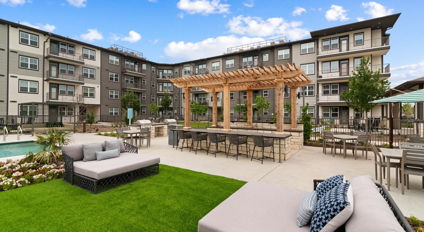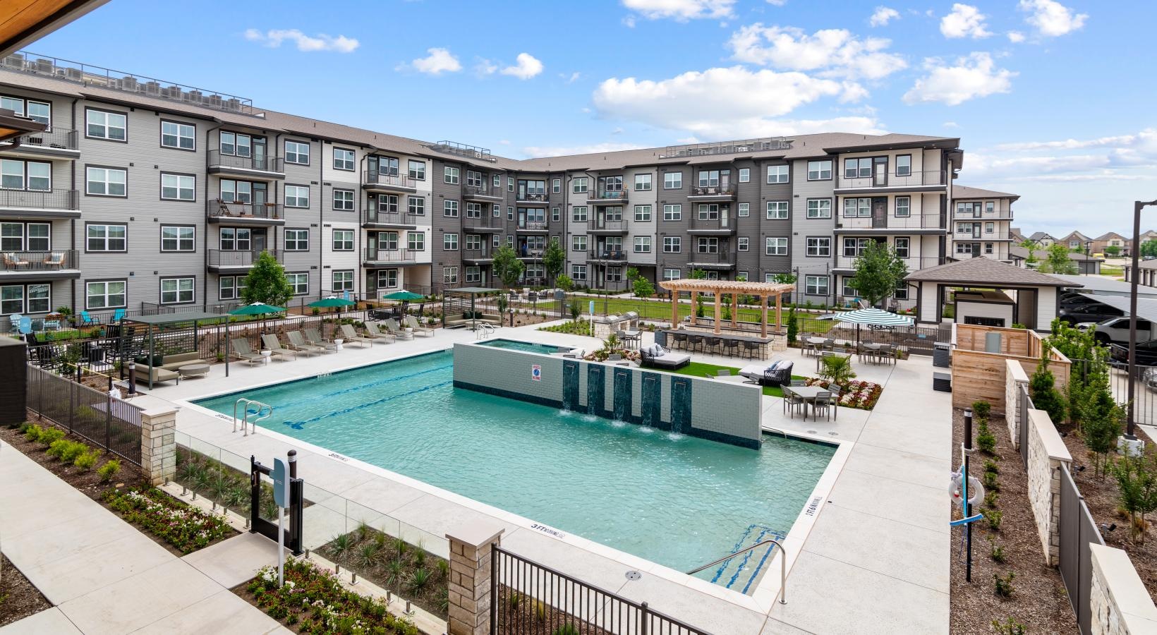 • a swimming pool in front of a building