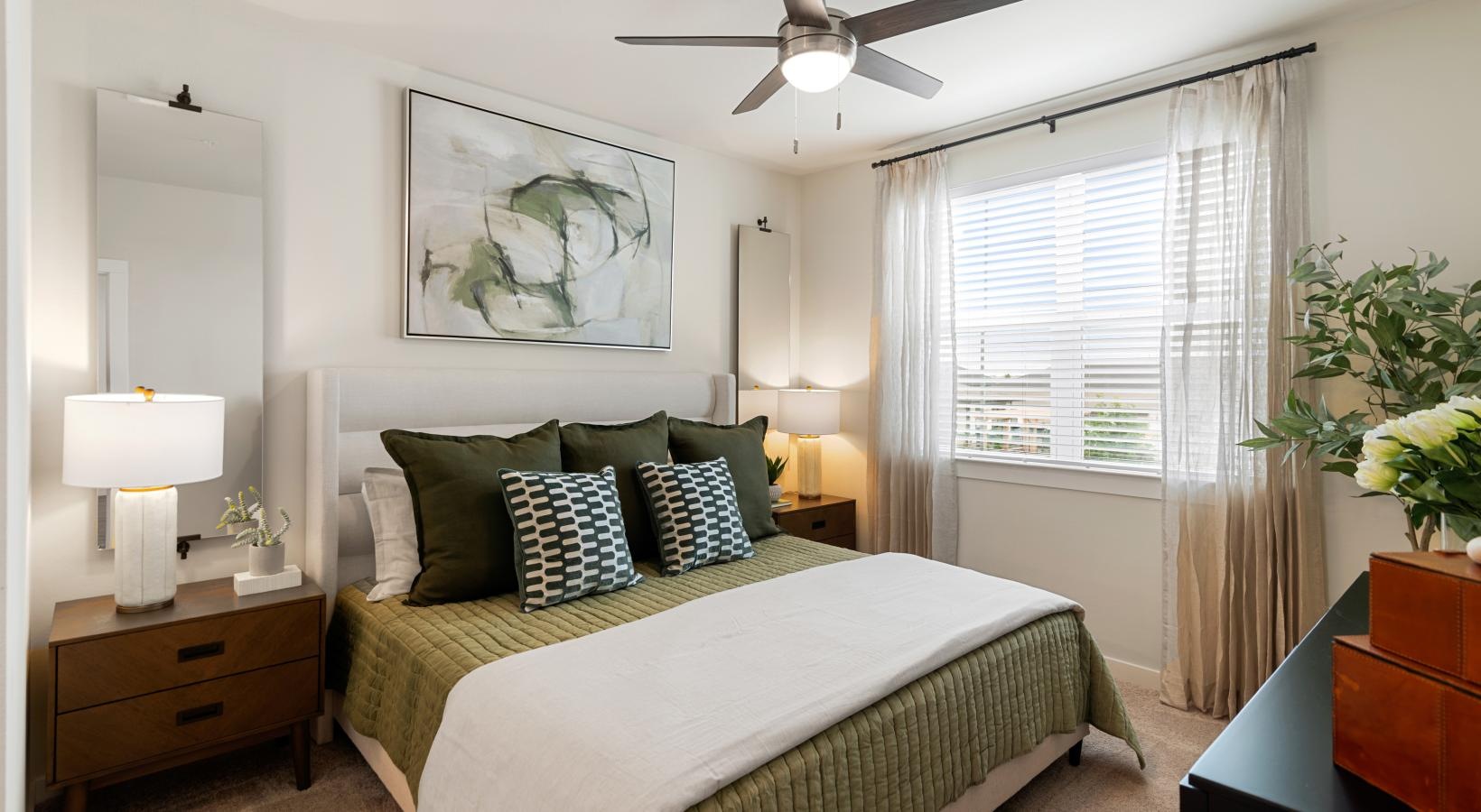 • a bedroom with a bed and a fan