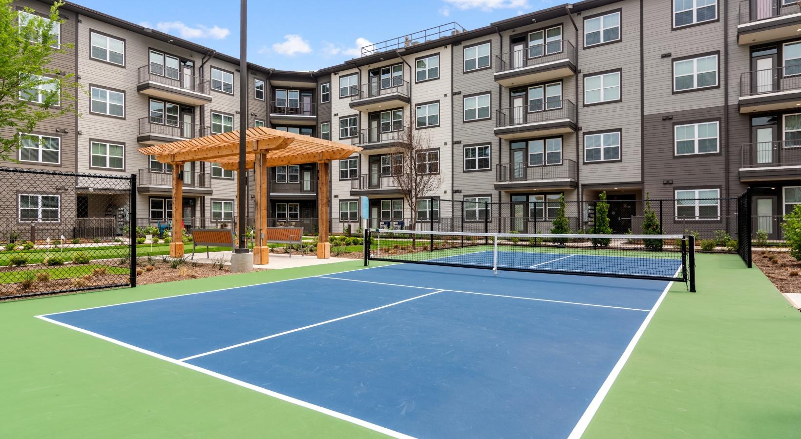 • a tennis court in front of a building