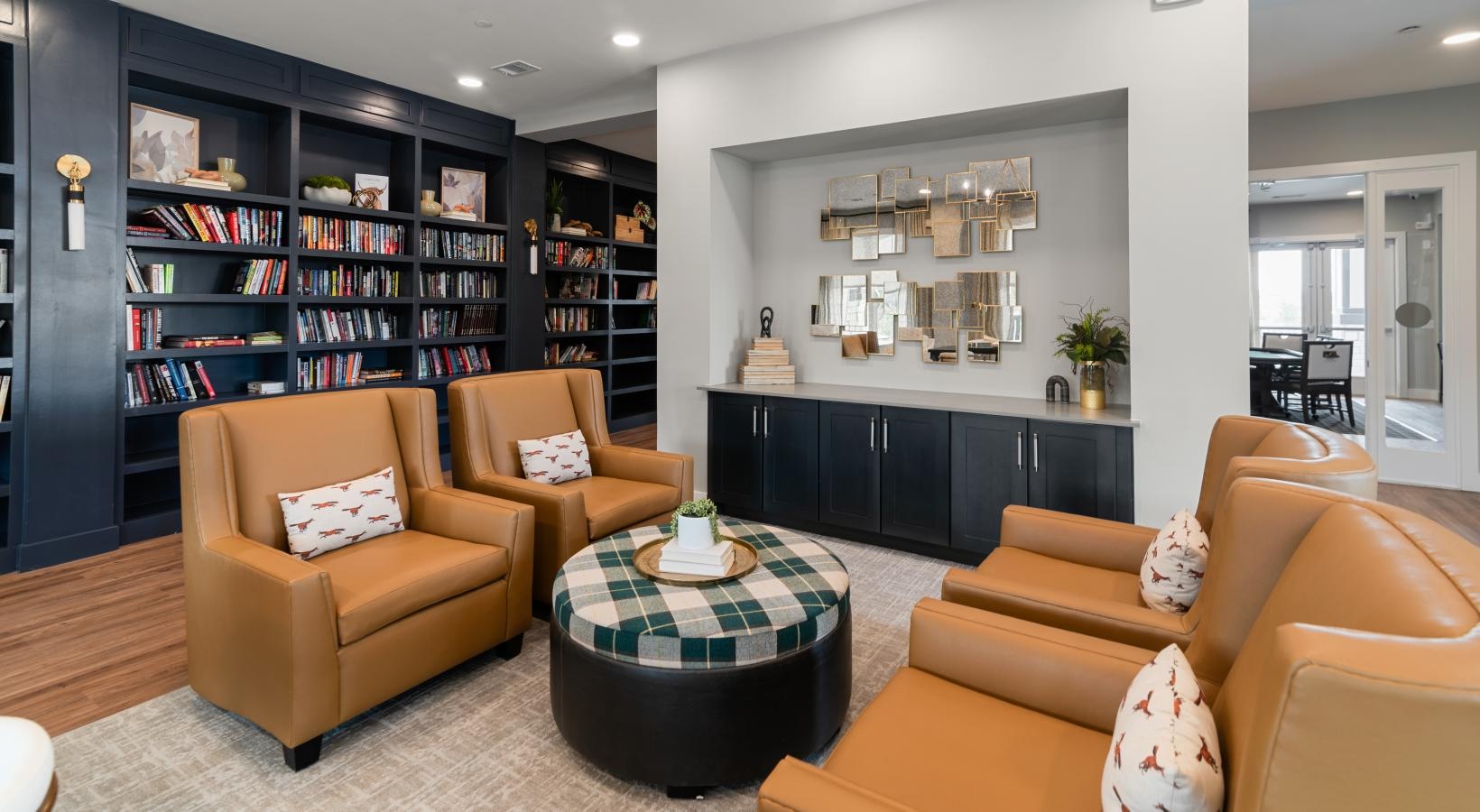 a clubroom with books and chairs