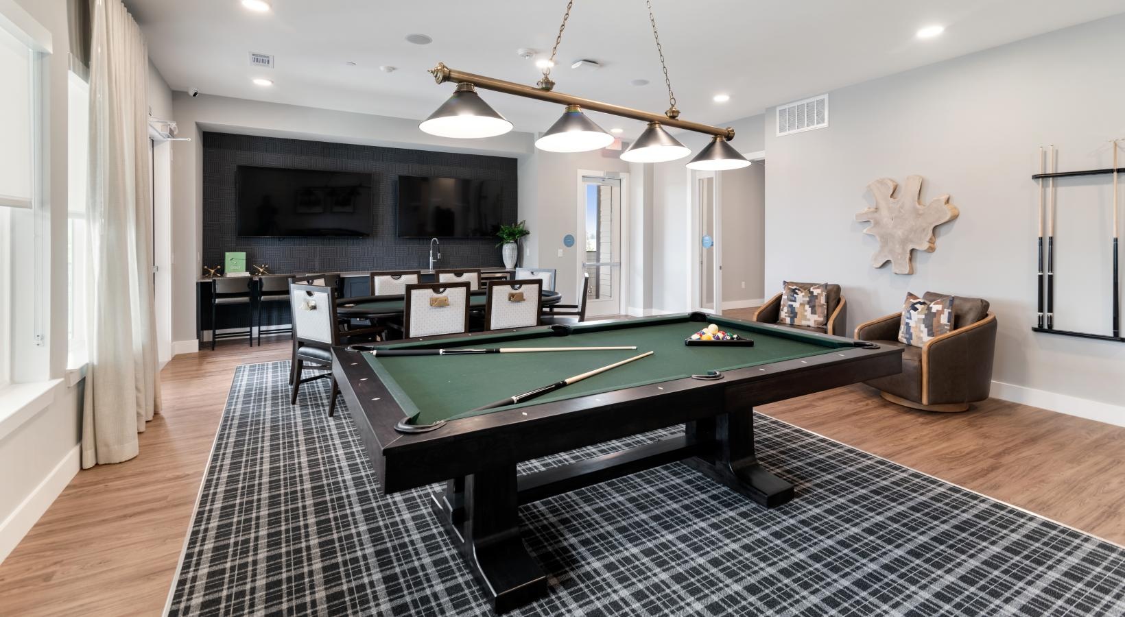 • a room with a pool table and chandelier