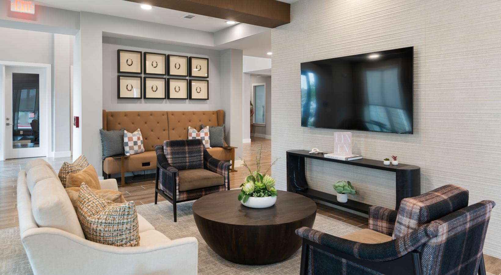 • a clubroom with a couch, chairs and a tv