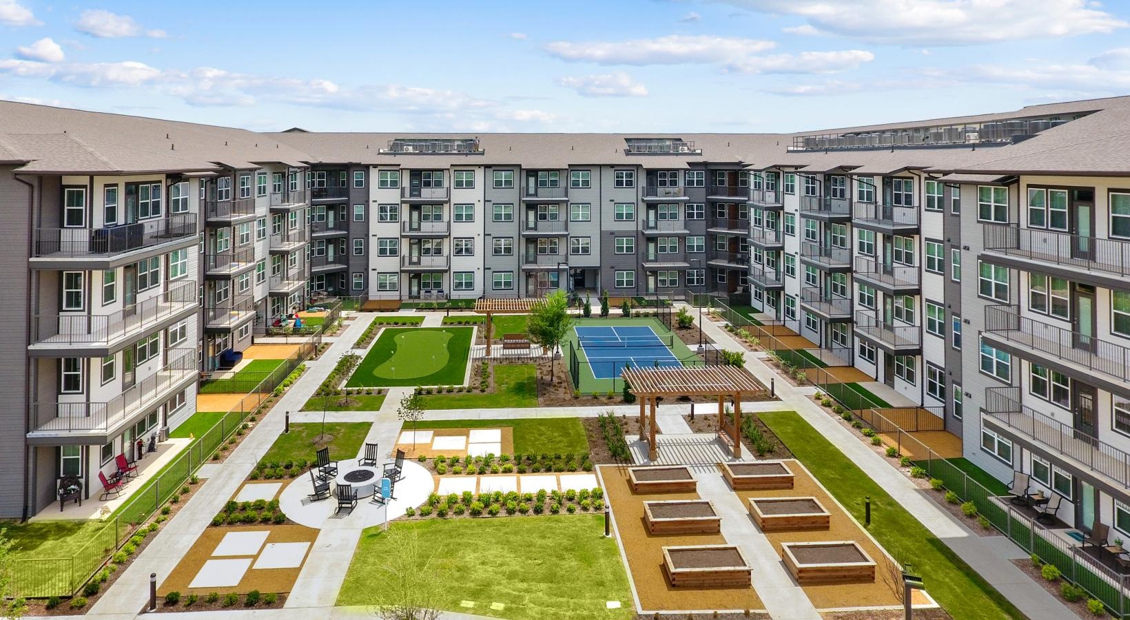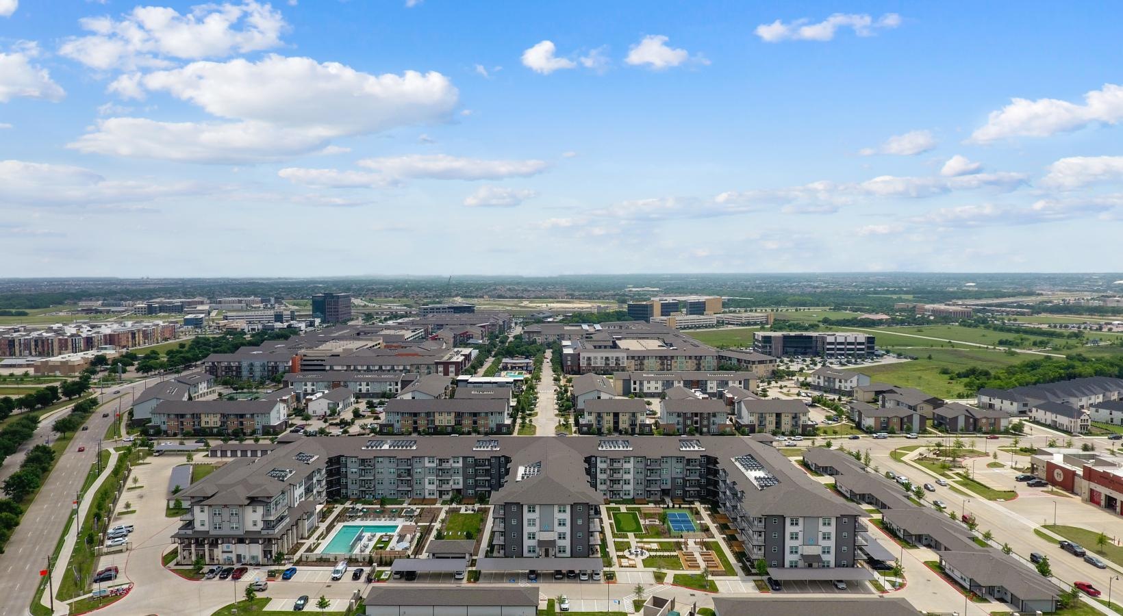 • an aerial view of a courtyard and a walkway
