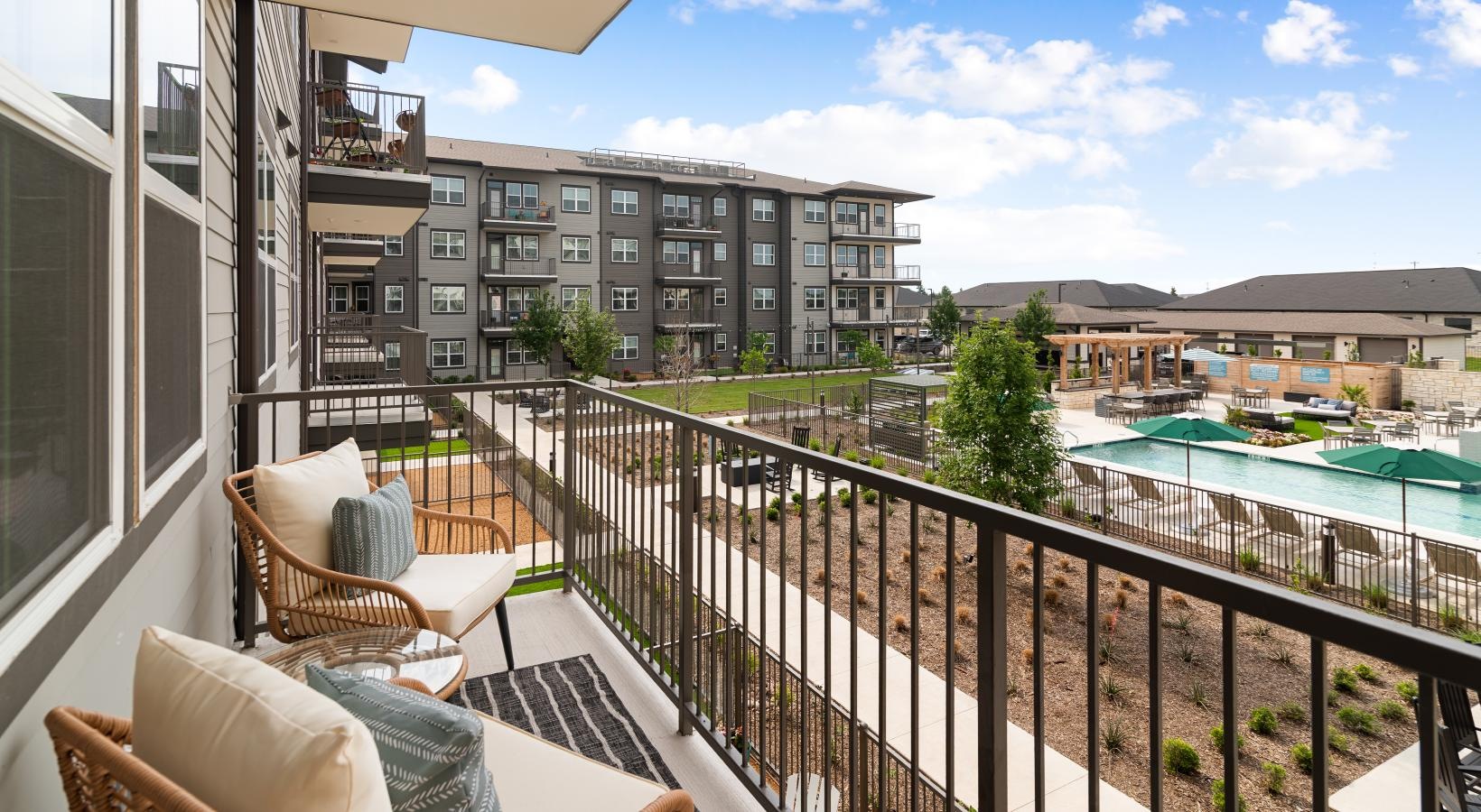 • a balcony with chairs and a table